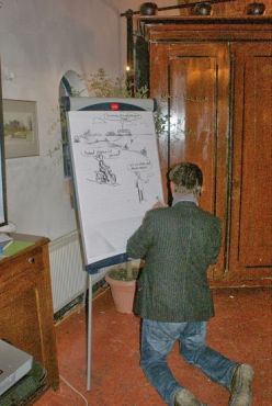 Reinoud schetst op papier de ideeën die tijdens de brainstormsessie naar voren komen. Hij hangt alle schetsen, hoe maf en onuitvoerbaar ook, aan de muur. De fantasie van de aanwezigen raakt nog meer geprikkeld en wellicht ontstaan er nog meer ideeën en dat doen ze bij voorkeur in beeld.